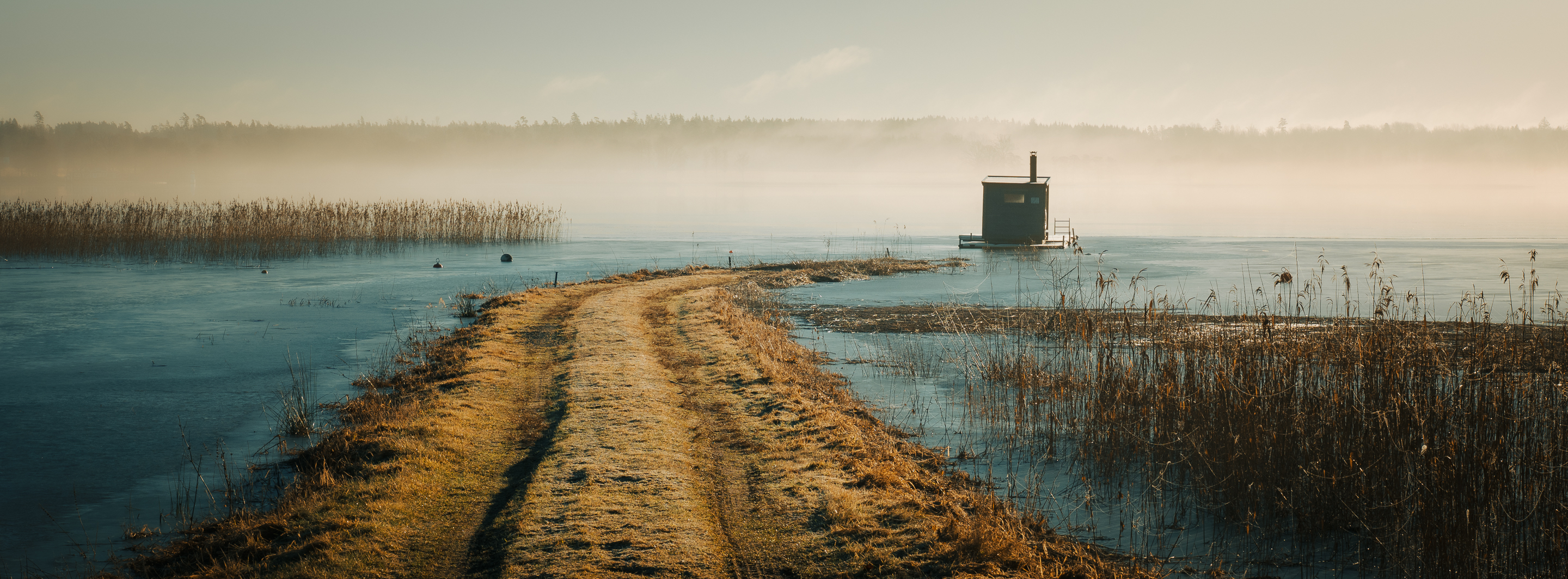 Morgonen bjöd på en vacker, frostig stillhet. En smal stig slingrade sig ut mot sjön, där en ensam bastuflotte låg inbäddad i det svaga diset. Isen låg tunn och sprucken, medan vassen stod kvar som ett minne av höstens sista andetag. Dimman svepte in landskapet i en drömsk tystnad, där ljuset gradvis målade världen i mjuka toner av guld och blått.